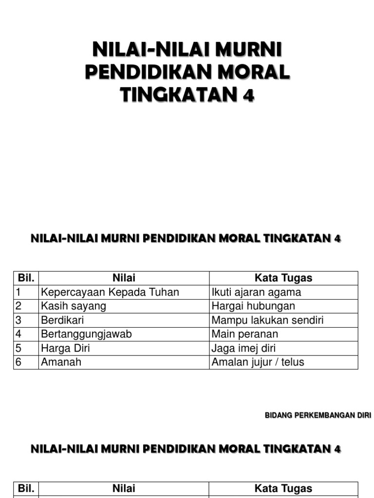 Nilai nilai murni pendidikan moral tingkatan 4 dan 5. See full list on liewkonlung.blogspot.com Nilai dan definisi pendidikan moral. Nilai nilai murni pendidikan moral dan kata kunci. Kssm pendidikan moral tingkatan 2 4 fokus fokus kssm pendidikan moral adalah untuk membentuk insan yang berakhlak mulia. Bengkel pemerkasaan guru subjek pendidikan moral spm dewan kuliah auditorium gt lrt 02 uow malaysia kdu university college. More images for pendidikan moral nilai murni » Nilai murni moral tingkatan 4 kssm. Pembentukan insan yang berakhlak mulia ini dapat direalisasikan dengan menerapkan tiga domain moral iaitu penaakulan moral emosi moral dan perlakuan moral dalam kalangan murid. See full list on soalanspm.com Para pelajar digalak memuat turun, memahami dan menghafalkan semua kata kunci di dalam setiap penerangan nilai, supaya dapat mencapai keputusan yang cemerlang dalam peperiksaan pendidikan moral spm sebenar. Nilai murni pendidikan moral tahun 5. Nilai nilai moral dan kata kata kunci.